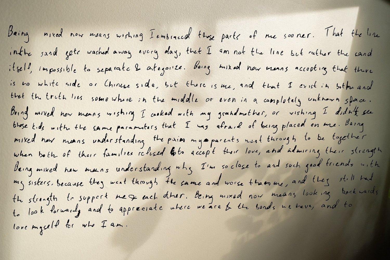 what we are is a photographic exploration of my family’s experiences with being a part of a mixed-race household. This contributes to the question that I will never stop asking myself in both my personal and professional life; what does it mean to me to be biracial? Discussing race and identity is not an easy or quick topic to unravel, and I know that it’s something that I’ll be thinking about for the rest of my life. With this project, I wanted to shift my perspective from solely myself to extend to the rest of my family; not only unfolding my feelings surrounding being apart of a mixed race family, but asking my parents what it feels like having children that have little to no resemblance to them, my siblings how experiencing being biracial during their childhoods in the 90s was different to mine in the early 2000s. This project is meant to capture the love we share for each other, the racism we’ve faced collectively in different contexts, and ultimately the unconventionality that makes us who we are. Through warm-toned images with recurring themes of growth represented through plants, written testaments from my family members, as well as going through archival photographs of my grandparents and elder family members, I hope to gain a deeper understanding of what connects us all through our different experiences within the same family.